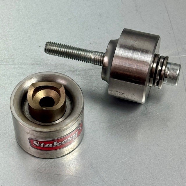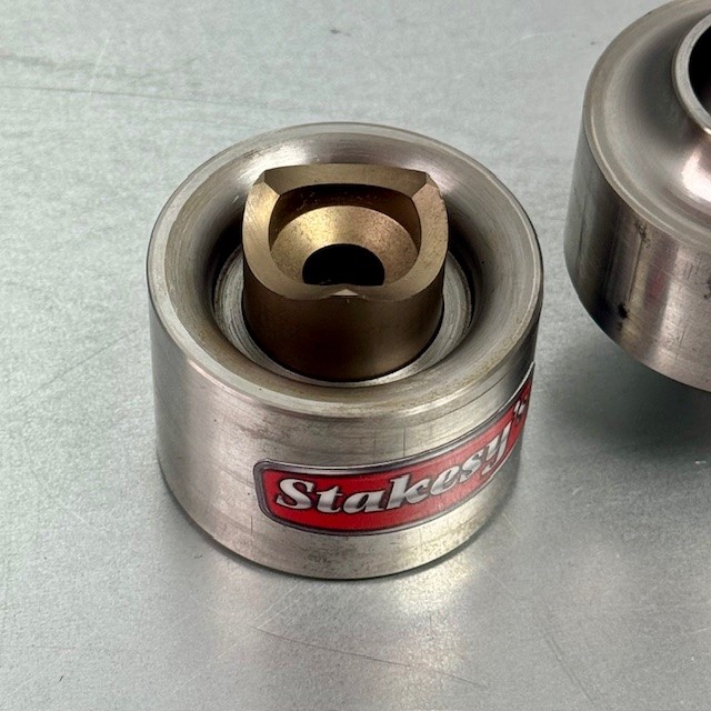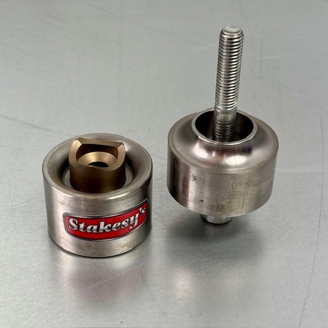Stakesy’s® automotive style punch and flares are machined in the UK from 4140 cromoly steel. The replaceable punches have a tolerance press fit and are machined from D2 tool steel which is then vacuum hardened and tempered resulting in the gold finish. The punch has a 3 prong cutting face that deforms the ‘slug’ against the stepped female cutting face making it easily removable without having to pry it out. This makes for faster repeat use on repetitive flaring. We machine an internal thread in the female rather than drilling straight through. This negates the need for a nut and also makes for more accurate docking. Another advantage is an optional threaded pull rod to be used with a hydraulic hole punching machine available for flaring material in situ such as vehicle chassis or roll cage webs (see below for knockout kits & pulls rods)